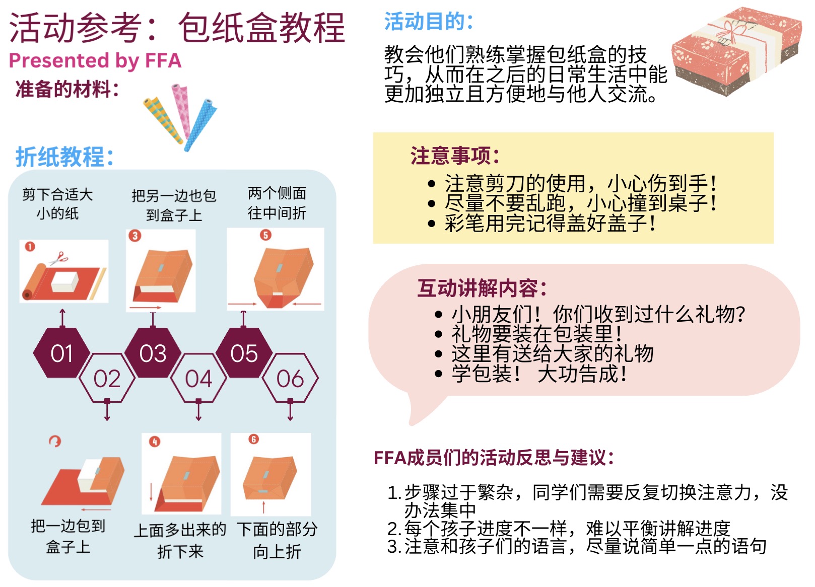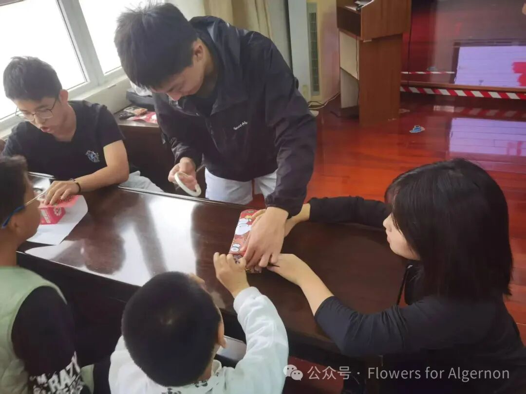 On October 22, 2025, Flowers for Algernon Zhixing conducted its first activity of the new year at the Changshu Special Education School, aiming to teach the children how to wrap paper boxes by themselves. During this event, all Zhixing members worked with the children to learn how to wrap presents to look like a gift box. This is not only for the children to enjoy the fun of doing their own wrapping, but more importantly, to teach them to be skillful in wrapping cartons so that they can be more independent in their daily life afterwards. Let’s take a look at what the FFA members did with the children!